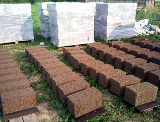 После укладки смеси в металлическую форму, ее вибрируют на станке, после чего готовый блок укладывают под навес на 3 недели для набора марочной прочности.