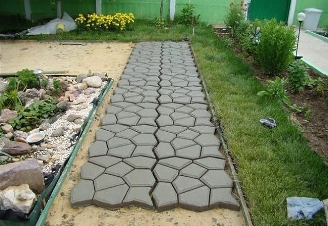 С применением готовых форм можно сделать площадку для отдыха, не снимая грунт, прямо на газоне. Пробивающаяся трава между элементами усилит эстетическую составляющую.