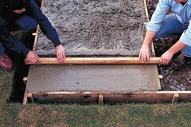 Примечание! Для качественных и долговечных дорожек и площадок подойдет бетон марки M200. Объемное соотношение цемента M500, песка и щебня для бетона M200 составляет 1:3,2:4,9. Воду в раствор добавляют постепенно до получения удобоукладываемой консистенции, в среднем это 0,6-0,8 литра на 1кг цемента.