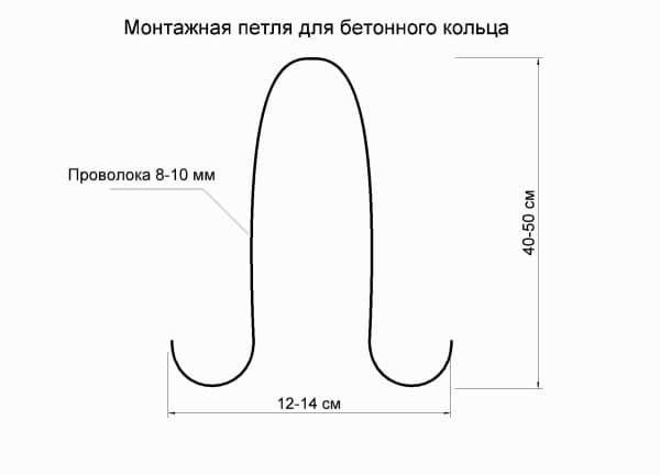 Для подъема и опускания колец с помощью крана, не забудьте установить в форму 4 монтажные петли (диаметр проволоки 8-10 мм). Загните у них концы и заглубите в бетон на 40-50 см.