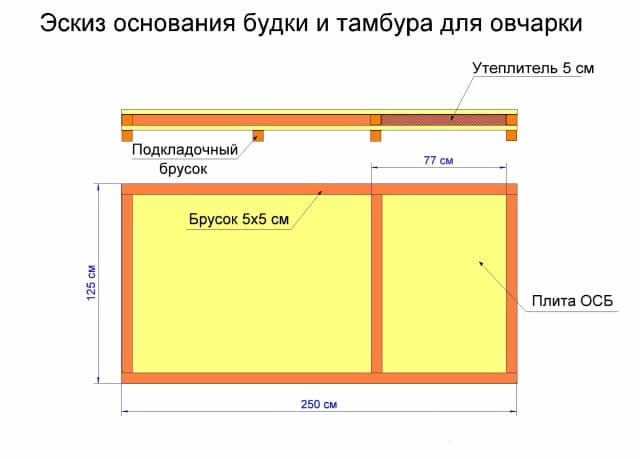 Первый шаг – нарезка брусков и сборка рамы основания. Для пола можно использовать целый лист ОСБ. Его габариты 1,25 х 2,5 метра отлично вписываются в рекомендуемые габариты будки и тамбура для немецкой овчарки.