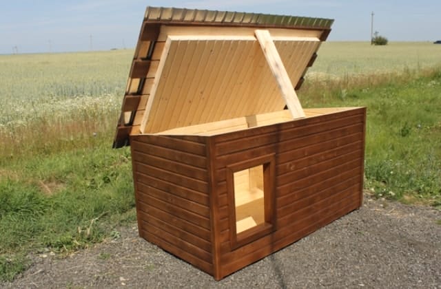 Плоскую откидную крышу можно использовать только в будке-вольере. Его строят в том случае, когда дом часто посещают незнакомые собаке люди.