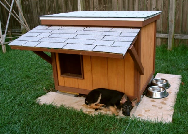 Крыша у будки может быть односкатной либо двускатной (шатровой). Второй вариант смотрится лучше, но знатоки овчарок часто выбирают первый. Дело в том, что собаке нравится лежать на крыше, следя за происходящим вокруг нее. Кроме этого, возможность запрыгивать на крышу и спрыгивать с нее полезна для физической формы пса, которого большую часть дня держат на привязи.