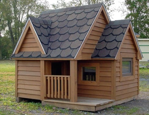 Некоторые модели – целые произведения искусств. Их делают похожими на загородные коттеджи в миниатюре. Они имеют различные декоративные элементы, например, резные окна, кованые перила. Но и цена такой будки будет не маленькой – 20000-80000 руб.
