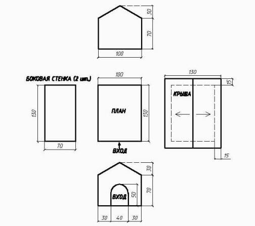 - ширина будки должна равняться длине собаки от носа до кончика хвоста, высота и глубина домика – высоте собаки.
