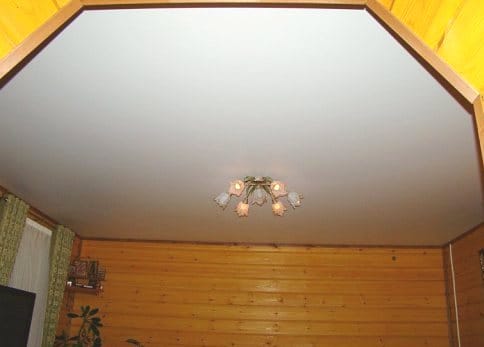 В деревянном доме можно сделать натяжные потолки. Их преимущества в том, что они выдерживают отрицательные температуры и не изменяют свои свойства под действием влаги. А для домиков, которые не отапливаются в зимний период, сырость – главный враг.