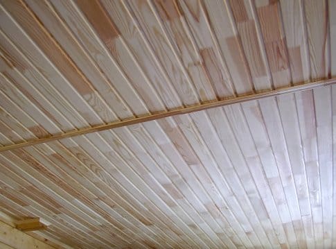 Следующий популярный вариант – это отделка вагонкой. Перед работой надо покрыть ее лаком или обработать антигрибковым раствором. Затем на потолке монтируется обрешетка из брусьев (толщина около 30 мм), причем поверхность должна быть до этого выровнена.