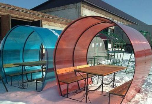 Для строительства можно использовать сотовый поликарбонат. Он придаст беседке оригинальную овальную форму и защитит спины присутствующих в ней людей от продувания.
