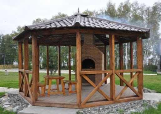 Беседку очень часто объединяют с барбекю или мангальной площадкой, получая под одной крышей удобную летнюю кухню и комфортную зону отдыха.
