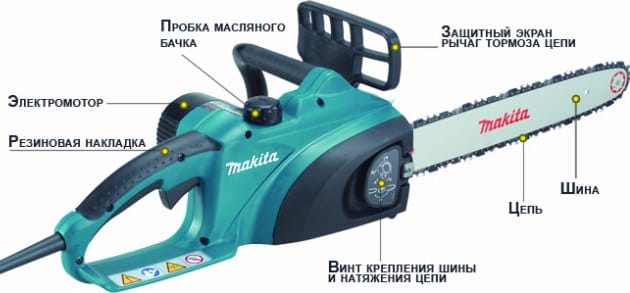 Основные рабочие узлы ручная электрическая цепная пила позаимствовала у бензиновой.