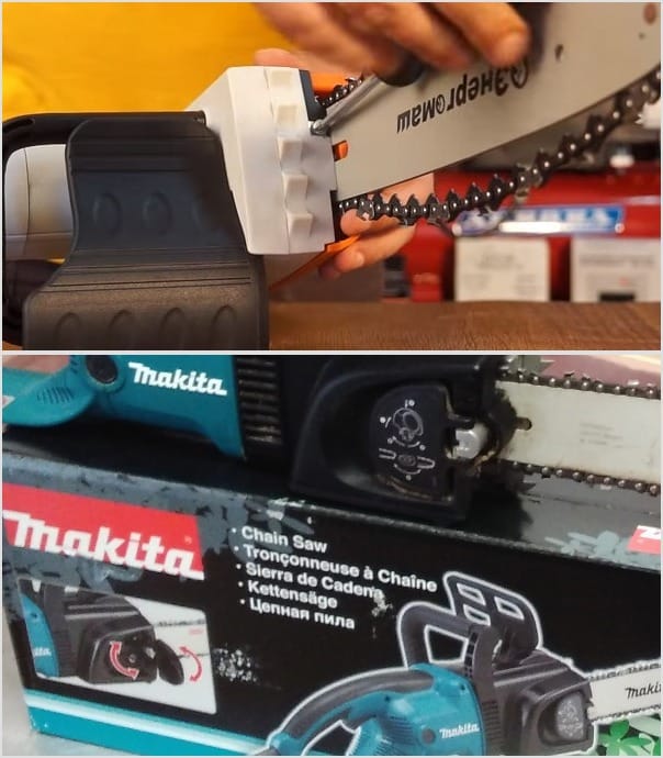 На всех без исключения электропилах стоит цепной тормоз. Он приводится в действие защитным щитком, расположенным перед рабочей рукояткой. Тормоз отключает двигатель в момент соприкосновения «носка шины» с твердым предметом. От такого контакта пилу отбрасывает вверх, оператор непроизвольно бьет левой рукой в защитный щиток, активируя блокировку мотора. Время срабатывания составляет доли секунды, поэтому инструмент не успевает нанести человеку ущерб.