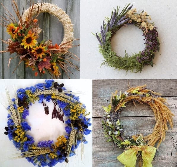 Совершенно иначе смотрятся в интерьере венки из сухоцветов. Занимая совсем мало места на стене или на двери, они способны наполнить помещение особенной аурой. Для изготовления обруча можно использовать сухие веточки, гибкие побеги ивы, металлические прутья или проволоку. Материал не природного происхождения маскируют шерстяной или хлопковой ниткой.