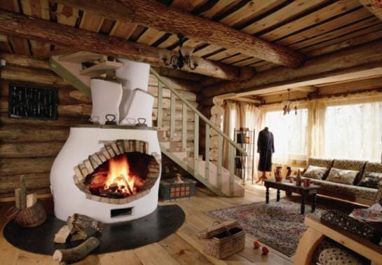 Грубоватые потолочные балки из хвойных пород дерева со временем под воздействием смол приобретают темные оттенки. Потолки так же выполняются из дерева, впрочем, как и мебель.