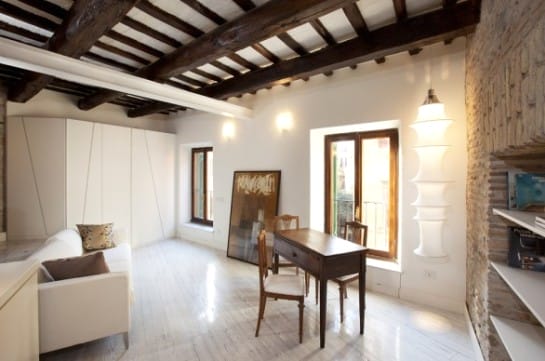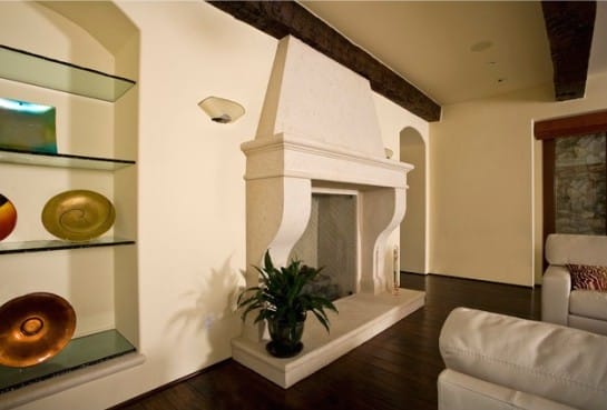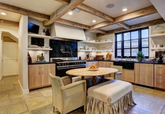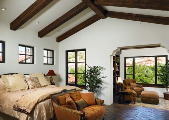 Декоративные балки на потолке – частый гость интерьера в средиземноморском стиле. Нередко балки тонируют для придания им более темного оттенка. Темные балки выгодно смотрятся на фоне белого потолка и стен.