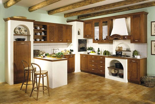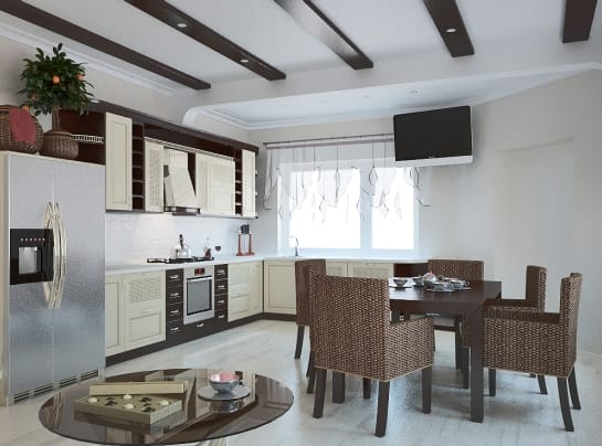 Стиль «кантри» с обилием деревянного декора так же не обходится без деревянных потолочных элементов.