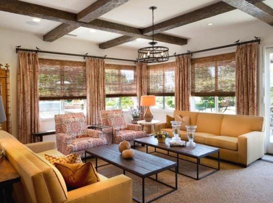 С помощью балок можно разделить помещение на зоны, украсив лишь одну его часть и выгодно подчеркнув ее важность.