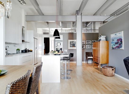 Так называемый промышленный дизайн становится все более и более популярным. Сочетание грубой фактуры стен с подобного рода балками полюбился неординарным и творческим натурам, а также заядлым холостякам.