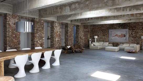 Открытые балочные конструкции из бетона с необработанной и не декорированной поверхностью, отсутствие перегородок и деления на зоны, часто открытые коммуникации, демонстративно выставленные напоказ – одно из условий стиля «лофт».