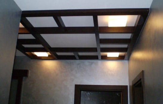 С помощью балок сооружают разнообразные и сложные конструкции на потолке, дополняя их подсветкой.