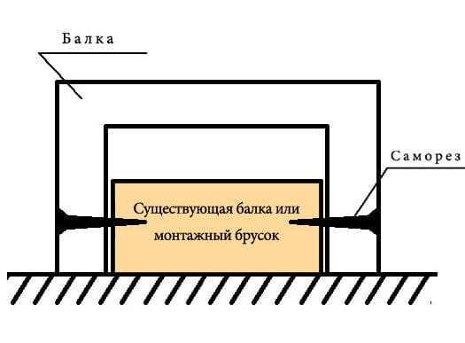 Для монтажа пустотелых деревянных фальш-балок используют каркас из металлического профиля или деревянного бруса. Непосредственно к каркасу крепят сами балки с помощью саморезов.