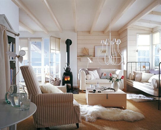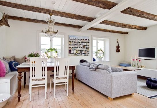 Скандинавский стиль также характеризуется обилием дерева. И потолочные балки в доме – частый атрибут. Правда, оттенки дерева более светлые, нежели в стиле «Шале».