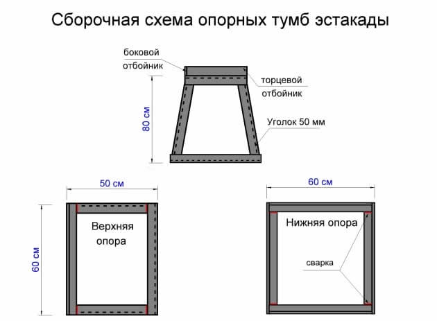 - Ширина верхней части опорных тумб равна ширине трапов.