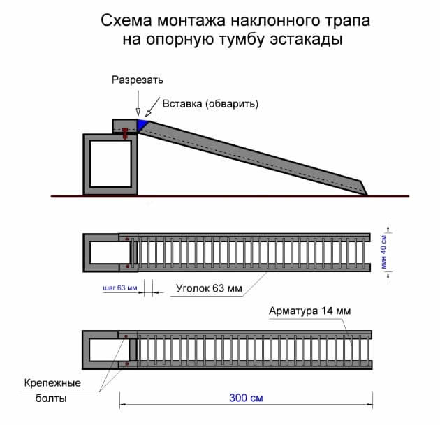 Горизонтальный и въездной трапы изготавливают из уголка 63 мм и арматурных прутков, выполняющих роль «лесенки». Длина наклонного трапа для легковой машины должна быть не менее 3 метров. Размер горизонтального участка выбирают, прибавив к длине автомобиля 1 метр. Ширина трапов не менее 40 см.