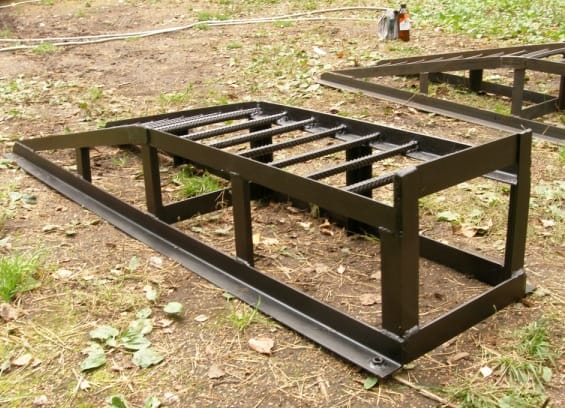 Для того, чтобы сделать эстакаду прочной, не следует экономить на металле. Для трапов нужно купить равнополочный уголок 63 мм. Опорные тумбы «стульчики» можно сварить из уголка с шириной полки 50 мм. Заполнение трапов делается рифленой арматурой сечением не менее 14 мм.