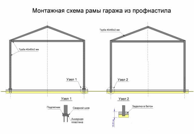 Тот, кто хочет построить гараж из профнастила своими руками, при составлении чертежа должен определиться: разборным или цельным будет его каркас. От этого зависит конструктив крепления стоек к фундаментной плите.