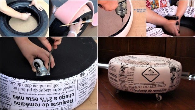 С помощью шуруповерта снизу прикручивают фанерный диск. Далее обтягивают покрышку плотной материей, скрепляя строительным степлером. К нижней фанере прикручивают ножки или колесики.