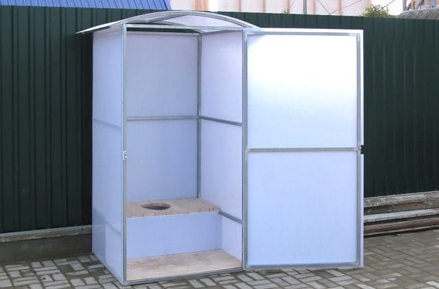 Для облицовки кабинки из металлопрофиля можно использовать полупрозрачный поликарбонат. Этот материал выглядит очень эстетично и не боится влаги.