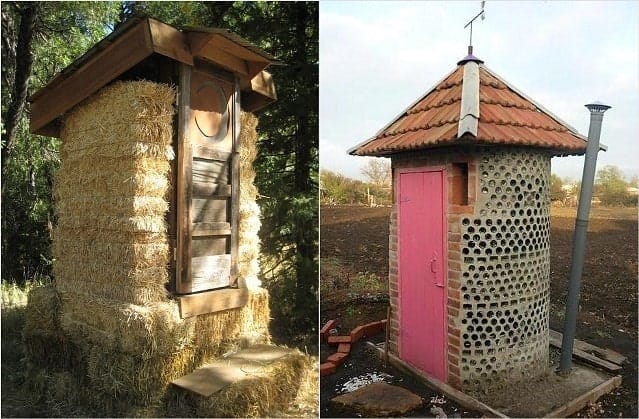 К разряду необычных материалов, используемых для сооружения отхожих мест можно отнести соломенные блоки. Кабинка, построенная из них, тепла и уютна. Тот, кто хочет поразить воображение соседей и гостей, не едет на стройбазу за материалами. Собрав энное количество пустых бутылок, он возводит из них нужник «всем на удивление».