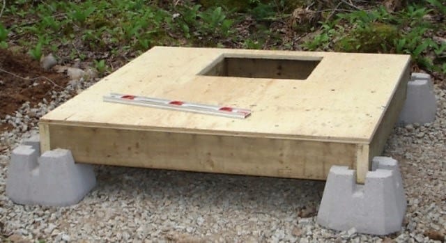 Основанием конструкции, пошаговое возведение которой мы рассмотрим, выбрана деревянная рама из антисептированного бурса. Ее можно поставить на фундамент из блоков или на неглубокую бетонную «ленту». Сверху к раме крепится толстый лист фанеры или плита OSB с вырезанным в ней прямоугольным отверстием.