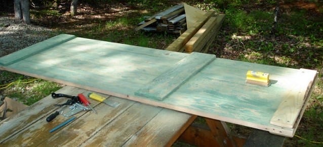 Дверь туалета собирают из шпунтованной доски, скрепленной поперечными планками для большей жесткости.