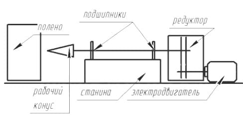 Можно просто купить резьбовой конус-насадку или готовые узлы, и собрать дровокол своими руками. Из схемы видно, что дровокол-шуруп состоит из станины, на которой закреплён двигатель. Далее, рабочий конус сидит на валу, который приводится в движение двигателем через понижающий редуктор.