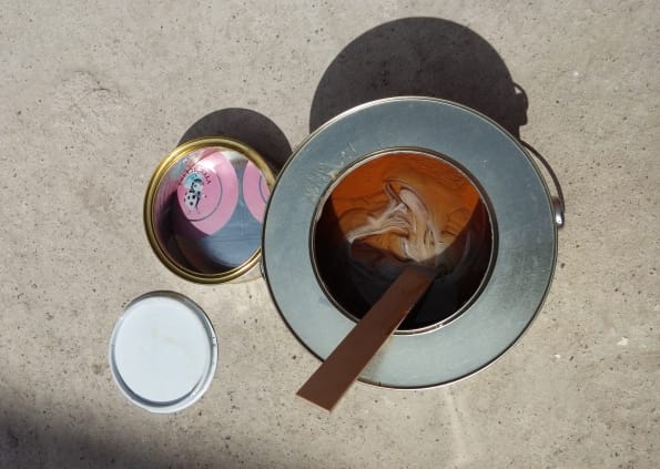 4) Так как этот эпоксидный состав является двухкомпонентным материалом, жидкая основа соединяется с затвердителем и активно перемешивается в течение 5-7 минут лопаткой, входящей в комплект.