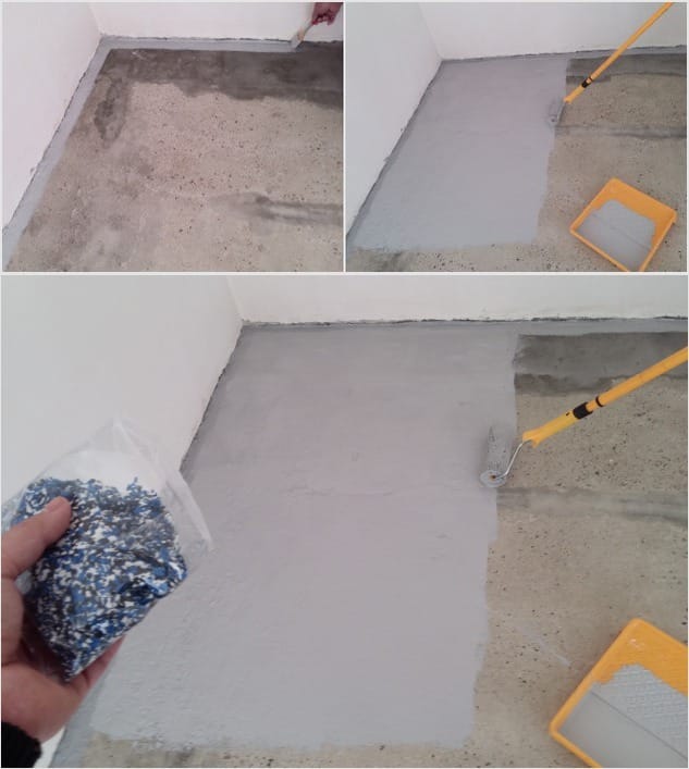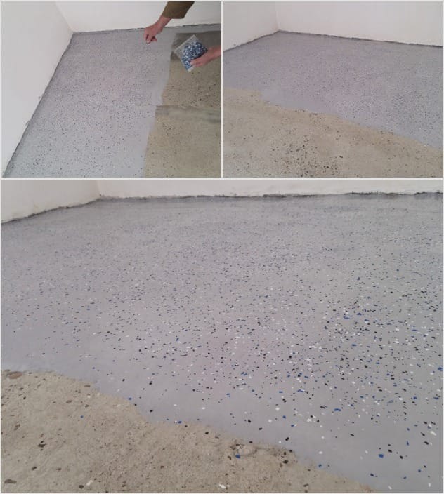 Нанеся покрытие на 1-2 метра, стоит густо рассыпать типсы. Если поверхность гладкая, то достаточно нанесения 1 слоя. Если же материал используется в автомастерских, автомойках с большой «проходимостью» автомобилей, рекомендуется наносить минимум 2 слоя.
