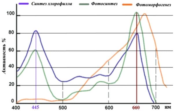Экспериментально установлено, что синий спектр изучения стимулирует рост растений, а красный приближает начало их цветения и ускоряет созревание плодов (график №1).