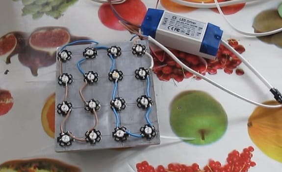 Светодиоды монтируют, наклеивая термопастой на алюминиевую радиаторную пластину. После установки их с помощью пайки последовательно соединяют проводами и подключают к пускорегулирующему устройству (драйверу) подходящему по силе тока.