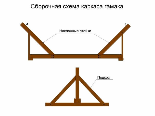 Сборка начинается с нижней опорной рамы. В два коротких отрезка бруса (нижние опоры) врезаются две доски и фиксируются к ним болтами с гайками и шайбами. После этого к опорам под углом симметрично крепят подкосы, оставляя между ними место для пропуска наклонных балок.