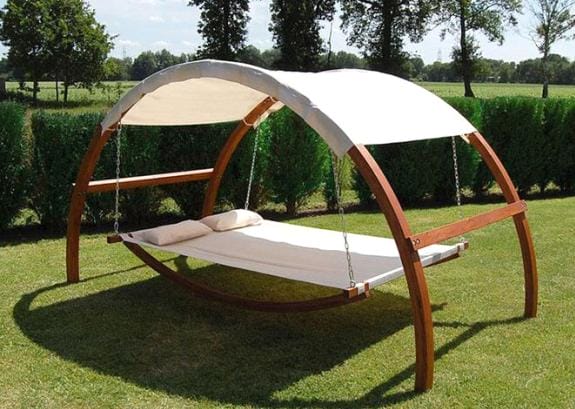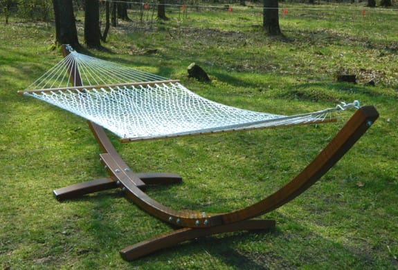 Главное преимущества такой конструкции – мобильность. Деревянный каркас можно перенести в любое удобное для отдыха место. Форма гамачной подставки может быть не только прямой, но и выгнутой в виде дуги.
