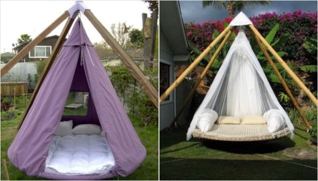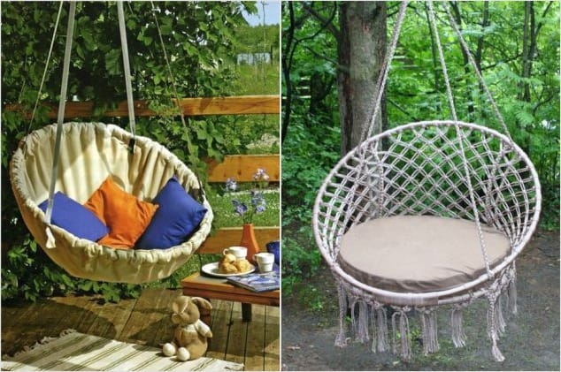 Идея висячей постели нашла применение в других оригинальных конструкциях. В качестве примера можно привести подвесное кресло-гамак, которое, к слову сказать, не так уж и сложно изготовить своими силами.