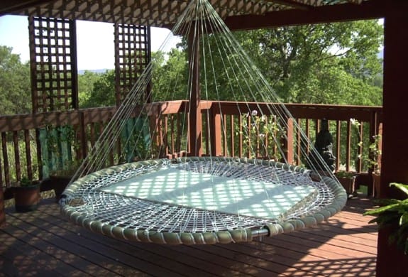 Идея смастерить гамак из обруча оказалась весьма плодотворной. Проще и легче всего такую конструкцию можно сделать, используя небольшой батут. Подвесив его на тросах к мощной потолочной балке в беседке, мы получим удобное ложе для отдыха.