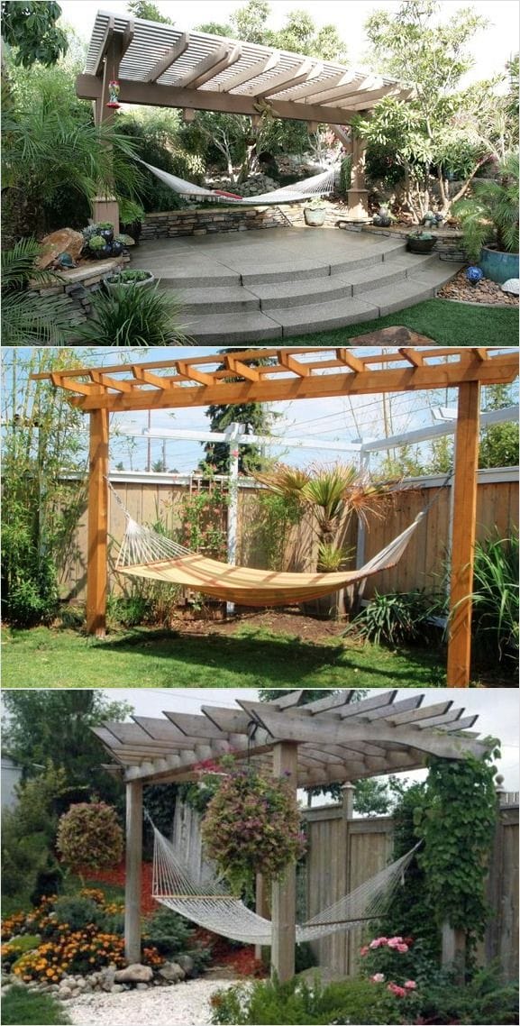 Не следует забывать о том, что гамак – не просто удобная подвесная постель, но и оригинальный элемент для украшения участка. Закрепив его на стойках декоративной беседки-перголы и снабдив ступенчатым подиумом, вы создадите живописный уголок для уединения.