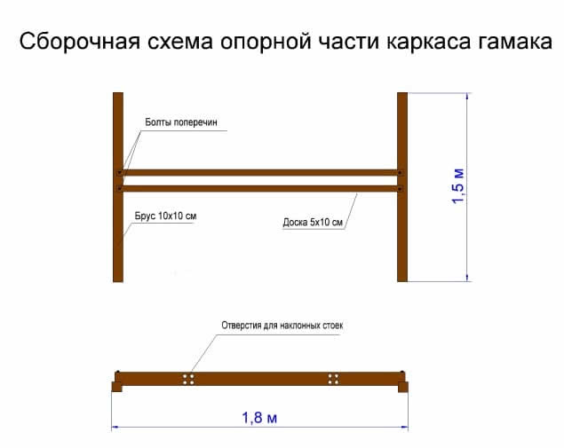 Если изготовление гамака вам кажется слишком сложным и долгим занятием, то можно купить готовое изделие, а каркас для него изготовить самостоятельно из дерева. В качестве примера рассмотрим несложную конструкцию, рассмотренную в начале статьи.