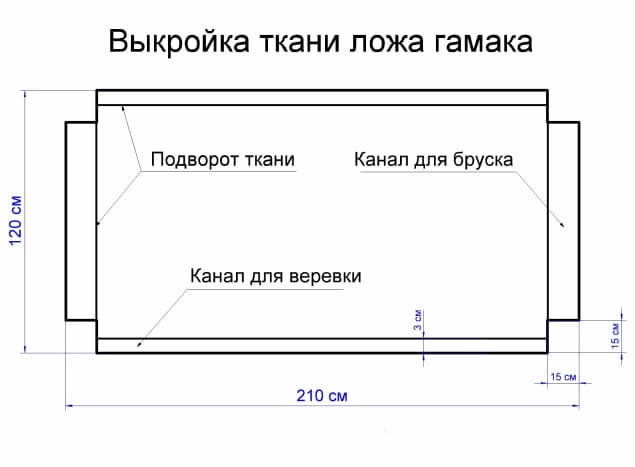 Первый шаг – изготовление выкройки ложа. Для него потребуется кусок плотной обивочной или брезентовой ткани размером 1,20х 2,10 метра. По углам выкройки нужно отрезать четыре квадратных куска материала размером 15х15 см для подворота краев ткани по длинной и узкой стороне. Внутри подворотов мы пропустим веревки (вдоль полотнища) и вставим бруски гамака (поперек ткани).