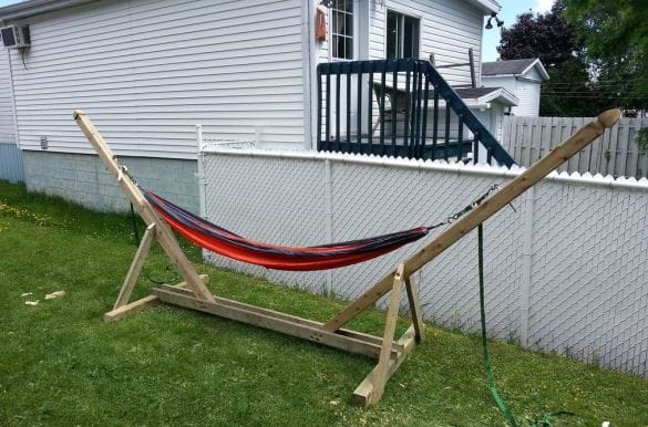 Кроме материала основы, есть и другое принципиальное отличие между висячими постелями — тип используемых креплений. Есть гамаки, которые устанавливают на каркас. На следующем фото мы видим подвесное ложе, концы которого прикреплены к двум наклонным деревянным стойкам.