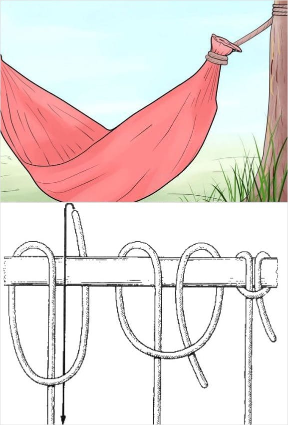 Самый простой вид гамака – тот, которым пользовались индейцы. Это кусок прочной ткани, концы которой собраны в плотный жгут и крепко перехвачены веревками, привязанными к деревьям или столбам. Прочную фиксацию концов такого ложа обеспечивает веревочный узел, получивший два названия: «коровий» и «голова жаворонка».