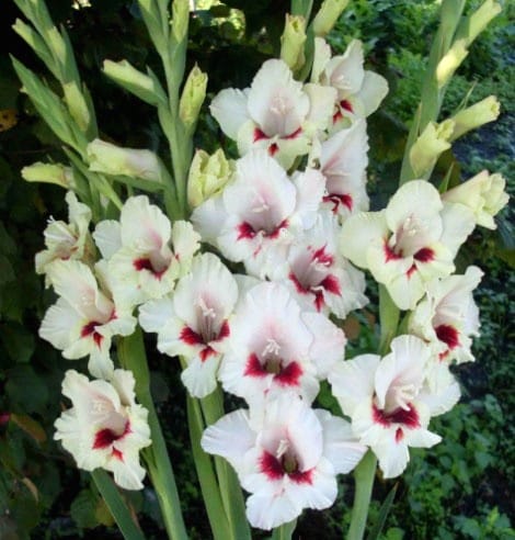 Гладиолус гибридный, или Шпажник (Gladiolus hybridus) – многолетнее растение, которое имеет несколько типов листьев (нижние – чешуевидные, верхние – мечевидные).