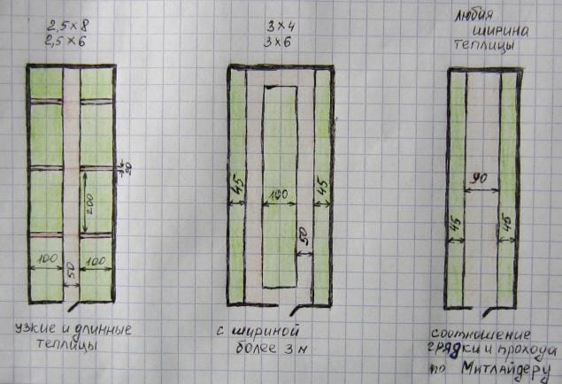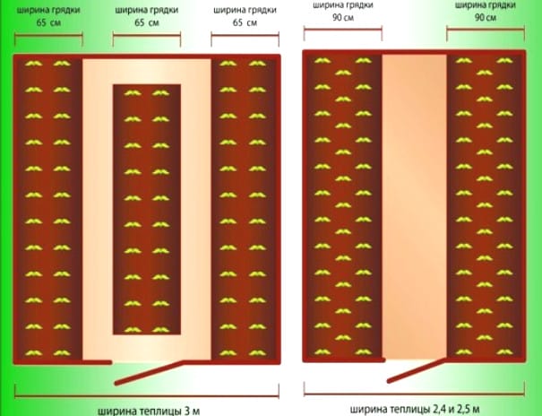 Схемы размещения грядок в зависимости от типа конструкции теплицы и ее размера